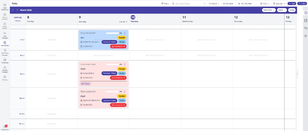 Switch to the Calendar view to see tasks and tickets on a weekly schedule. The calendar shows: