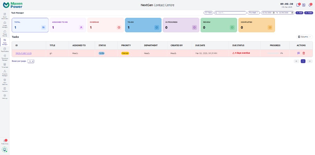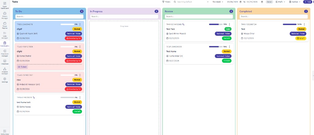 - Task cards — Each card shows ID, title, assignee, progress (%), priority, due date, and status (e.g., Overdue by 1d, days left). Tasks linked to tickets show a Ticket button.