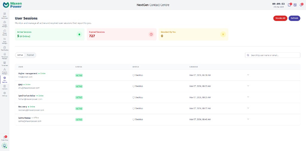 Go to User Sessions in the Super Dashboard sidebar to monitor and manage all active and expired sessions:
